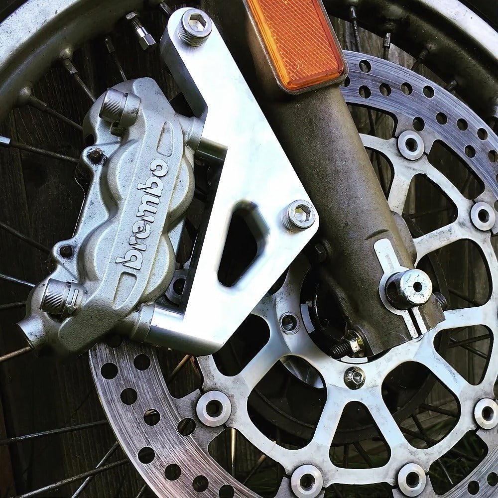 Need betterbrakes on your old BMW Airhead project? These adapter kits will allow you to run a radial 4 piston caliper and a much larger brake disc.